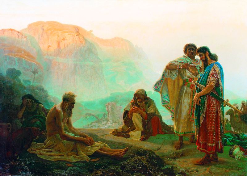 Job and His Friends. Job’s wife grieves behind Job, while his friends, Eliphaz, Bildad, and Zophar, observe his impoverished condition. Ilya Repin (1844–1930), oil on canvas. 1869