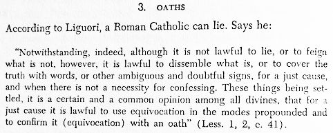 Such ‘prevarication’ forms the basis of that taught by Jesuits. It is called the doctrine of ‘equivocation’ (lie, sophism) or ‘mental reservation’.