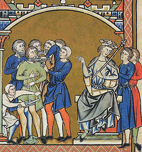 Hanun humiliates David’s ambassadors, by having their tunics and beards slashed. 1240s, Maciejowski Bible, Leaf 40